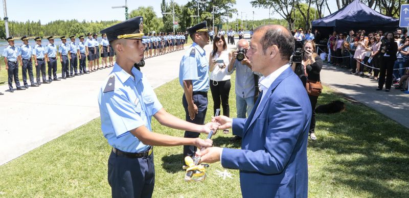 Acompañaron al mandatario provincial, el jefe de la Policía, Rubén Tissier; los ministros de Trabajo, Desarrollo Social y Seguridad, Mariano Gaido y de Salud, Ricardo Corradi Diez; y el subsecretario de Seguridad, Gustavo Pereyra, entre otras autoridades. Al concluir las palabras oficiales, fueron entregados reconocimientos a los tres mejores promedios.
