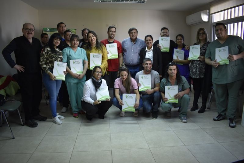 El Intendente Municipal de Plaza Huincul Lic Juan Carlos Giannattasio junto al Secretario Gremial Horacio Cabezas, Secretario General Hector Jara de la Asociación de Trabajadores de la Sanidad y Hugo Alcaraz y Gabriel Iril Delegados del Sanatorio hizo entrega de 55 terrenos a los empleados del Sanatorio Plaza Huincul.