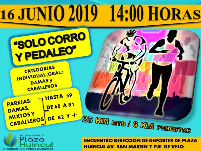 La Municipalidad de Plaza Huincul, a través de la Dirección de Deportes, comunica que el próximo Domingo 16 de Junio se llevara a cabo la actividad de "Sólo Corro y Pedaleo".