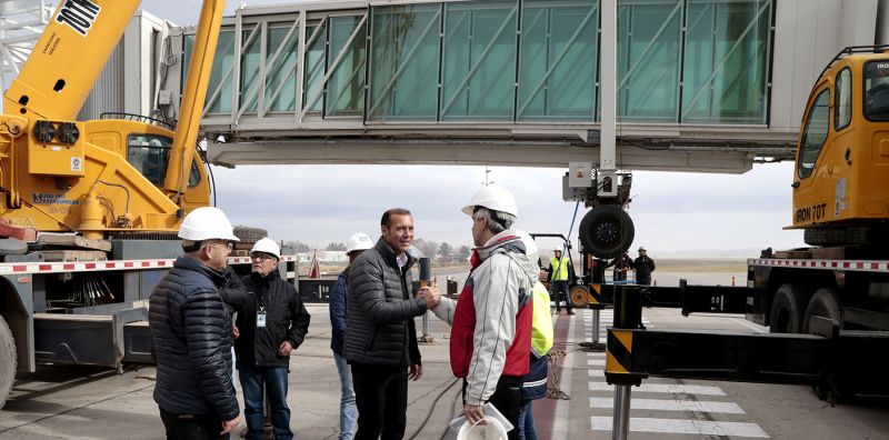 “Hoy están montando la manga telescópica con el conector que vincula a la nueva sala de embarque y pre embarque, que va a facilitar el ingreso directo de pasajeros al avión sin pisar la pista, proporcionando mucha más comodidad y duplicando la cantidad de metros cuadrados habilitados en el aeropuerto”, señaló.