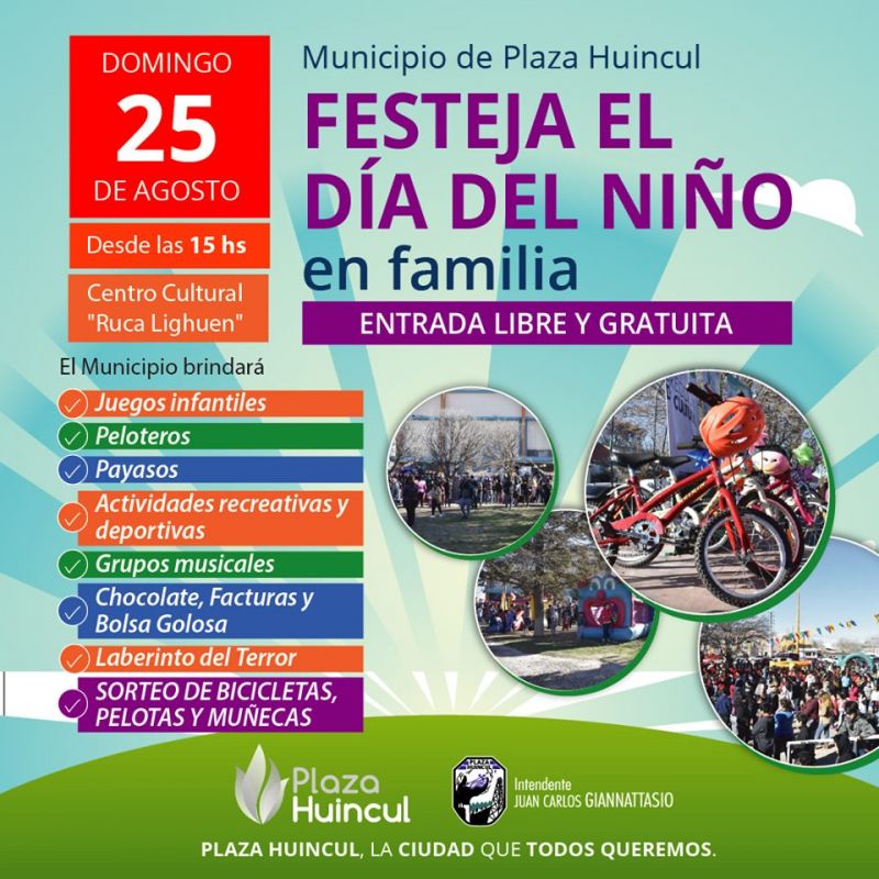 La Municipalidad de Plaza Huincul, en forma conjunta con varias Direcciones Municipales comunica que para el día Domingo 25 de Agosto se llevarán a cabo los festejos por el "DÍA DEL NIÑO".