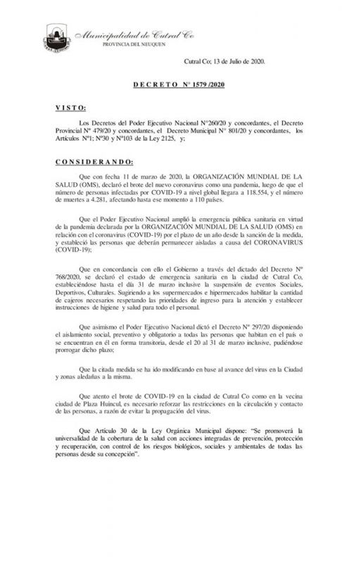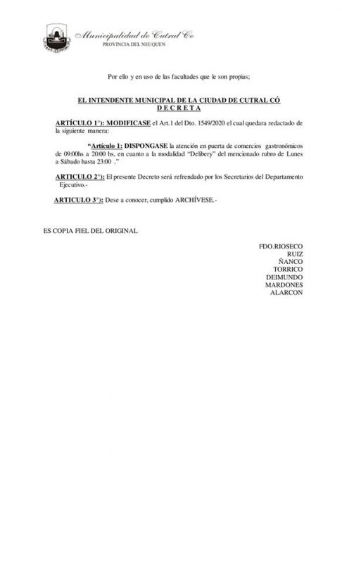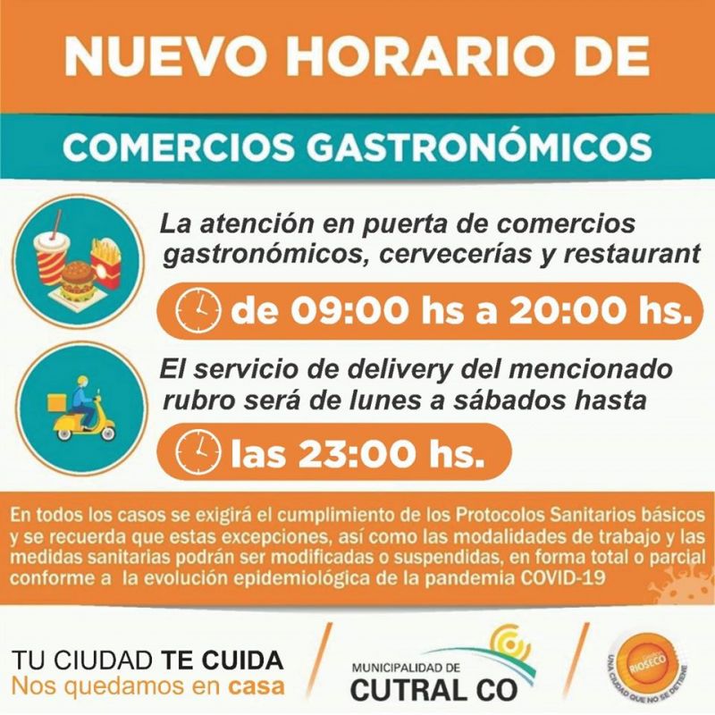 La Dirección de Comercio y Bromatología de la Ciudad de Cutral Có, informa la modificación del Artículo 1° del decreto 15499/20 emitido por el Ejecutivo Municipal, el cual quedará redactado de la siguiente manera: “ESTABLEZCASE la atención en puerta de Comercios gastronómicos, cervecerías y restaurant, en el horario de 09:00 hs a 20:00 hs. El servicio de Delivery del mencionado rubro será de Lunes a Sábado hasta las 23:00 hs.