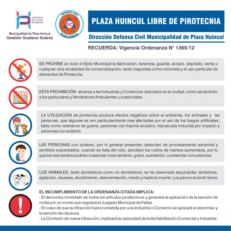 La Municipalidad de Plaza Huincul mediante la Dirección de Defensa Civil informa que se encuentra en vigencia la Ordenanza N° 1365/12, donde SE PROHÍBE en todo el Ejido Municipal la fabricación, tenencia, guarda, acopio, depósito, venta o cualquier otra modalidad de comercialización, tanto mayorista como minorista y el uso particular de elementos de Pirotecnia.