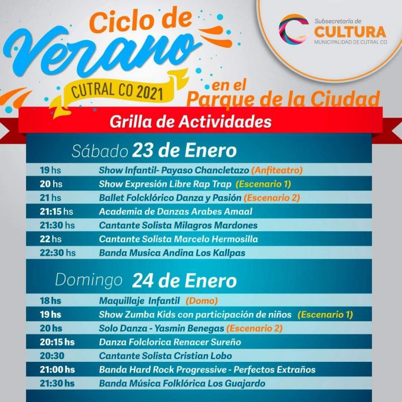 Con una gran oferta de actividades para todas las edades se llevará adelante el ciclo de verano cultural 2021 en el Parque de la Ciudad de Cutral Co.