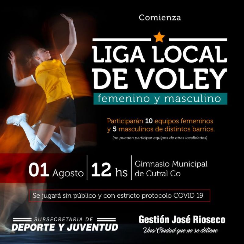 La Subsecretaría de Deportes y Juventud dependiente de la municipalidad de Cutral Có informa que el día domingo 01 de agosto comienza la liga local de voley femenino y masculino. Participarán 10 equipos femeninos y 5 masculinos de distintos barrios de la ciudad de Cutral Có donde jugarán todos contra todos, cabe aclarar que el cupo de participantes es limitado por los protocolos de pandemia.