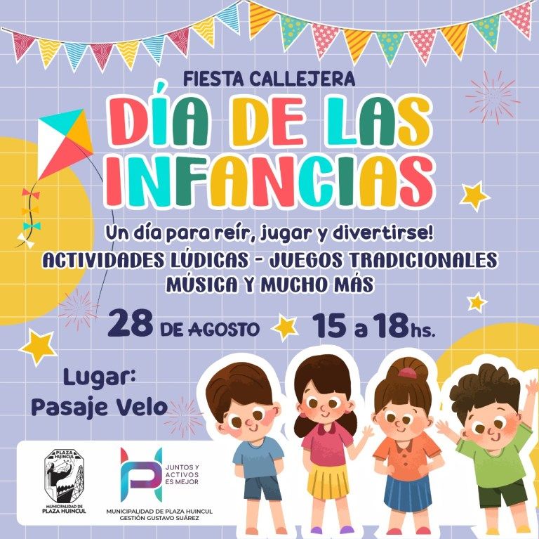 La Municipalidad de Plaza Huincul a través de la Dirección de Vecinales, comunica que el próximo 28 de agosto a partir de las 15, se estará realizando el festejo por el Mes de las Infancias.