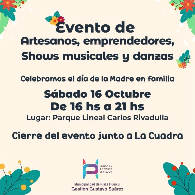 La Municipalidad de Plaza Huincul, convoca a emprendedores artesanos y pequeños productores a participar de la “Feria Día de la Madre” que se llevara a cabo el día sábado 16 de octubre en el Parque Lineal Carlos Rivadulla de 16 a 21 horas.