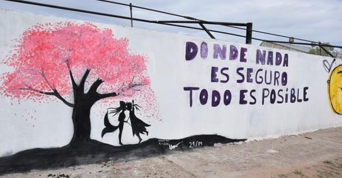 Sebastian Almarza fue el artista que resultó ganador y pudo plasmar su dibujo en un paredón ubicado en avenida Pedro Rotter. Según comentó, se basó en la leyenda japonesa del árbol de cerezo para desarrollar la obra “En primer lugar realicé el bosquejo con carbón para poder corregir trazos sobre la marcha , y luego procedí a pintar las siluetas y las flores”.