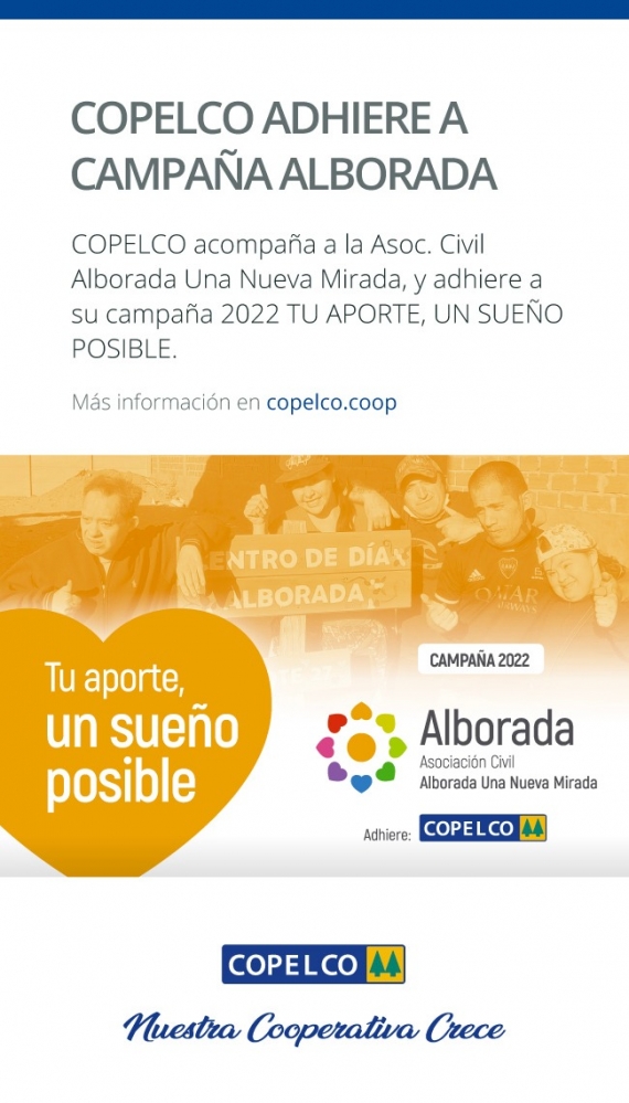 Desde la cooperativa Copelco se tomó la decisión de acompañar y adherir a la Asociación Civil Alborada Una Nueva Mirada, en esta campaña 2022 TU APORTE, UN SUEÑO POSIBLE. El fin de esta campaña, permitirá a la Fundación Alborada la construcción del Centro de Día Integral.