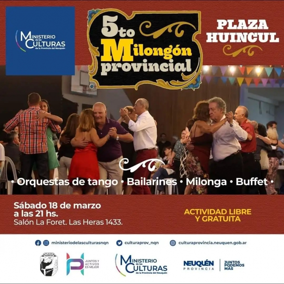 Como es sabido, el Ministerio de las Culturas continúa desarrollando acciones y actividades culturales de forma conjunta con la Municipalidad de Plaza Huincul, y este Milongón Provincial forma parte de las últimas iniciativas que establece a nuestra ciudad como sede oficial para su realización.