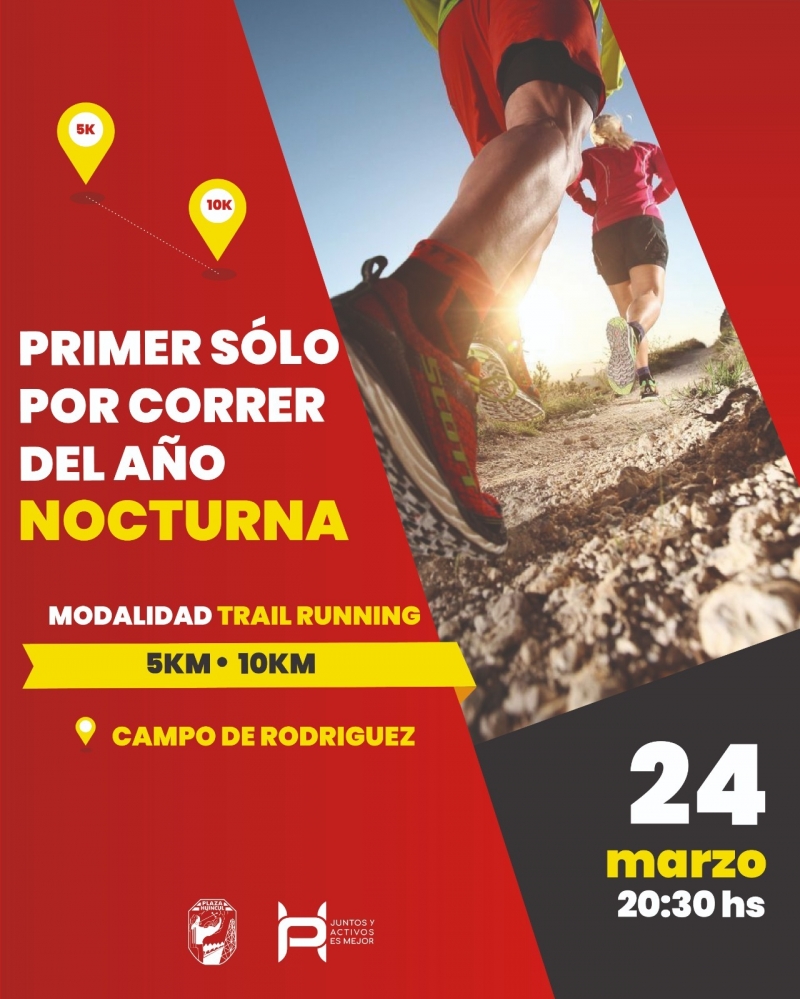 La Dirección de Deportes de la Municipalidad de Plaza Huincul invita a la comunidad a participar de la carrera “Sólo por Correr Nocturno” de 10 y 5 Km con modalidad Trail Running. La misma se realizará el viernes 24 de Marzo a partir de las 20:30 hs. El lugar de concentración será el “Campo de Rodríguez”