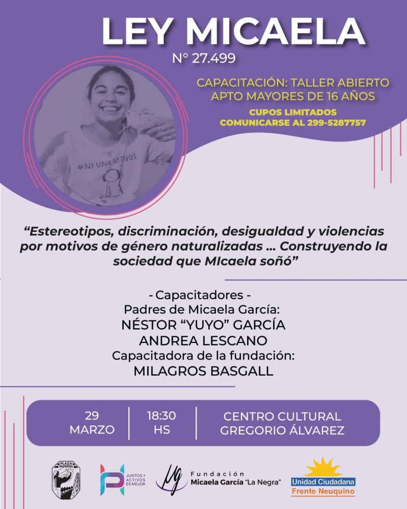 El día miércoles 29 a las 18:30hs en el Centro Cultural Gregorio Álvarez se dará una capacitación abierta de forma gratuita para mayores de 16 años en el marco de la Ley Micaela. La misma será dada por los papás de Micaela García, víctima de femicidio en el año 2016. Ésta Ley establece la capacitación obligatoria en género y violencia de género para todas las personas que se desempeñan en la función pública, en los poderes Ejecutivo, Legislativo y Judicial de la Nación.