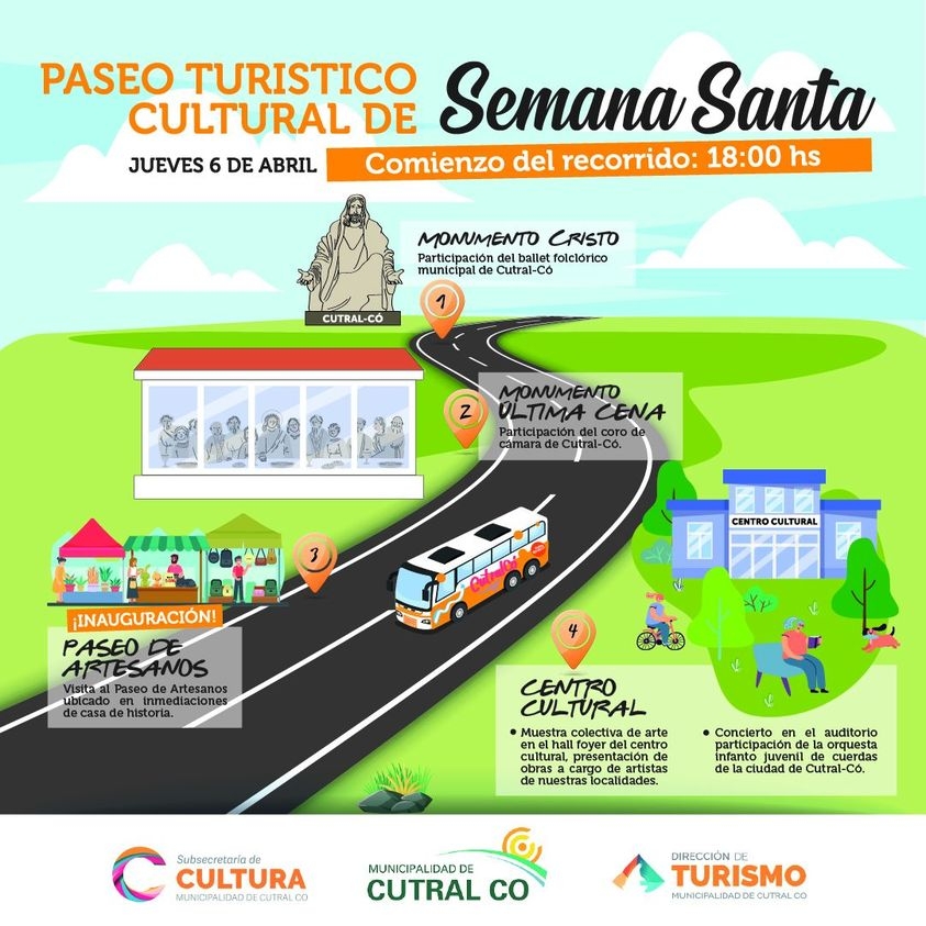 El próximo jueves 6 de Abril se realizara en Cutral-Có el paseo turístico cultural de semana santa. El mismo comenzara a partir de las 18 hs desde el Cristo emplazado a la vera de Ruta Nacional 22, es una actividad libre y gratuita. Donde se realizará la presentación del Ballet Folclórico Municipal. Sigue hacia la escultura de la Última Cena, donde estará el Coro de Cámara de Cutral Co.