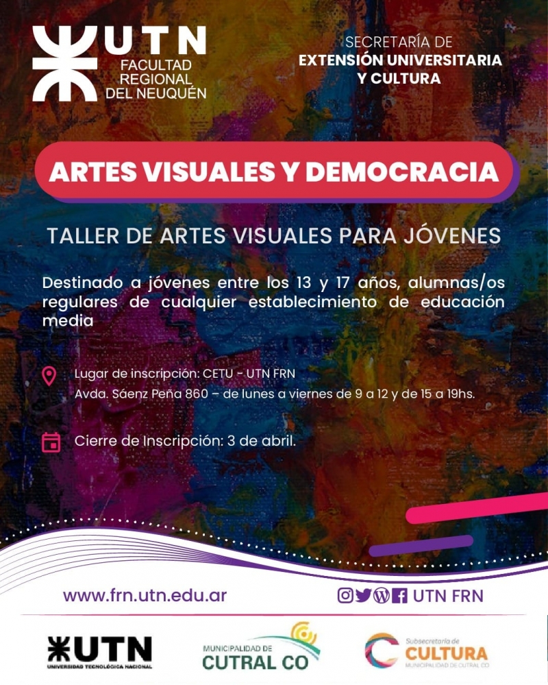 La UTN-FRN mediante la Secretaría de Extensión Universitaria y Cultura invita al Taller gratuito de Artes visuales para jóvenes.Se encuentra abierta la inscripción gratuita a todos los jóvenes entre 13 y 17 años de Cutral- Có y Plaza Huincul interesados en participar en el taller denominado “Artes Visuales y Democracia “