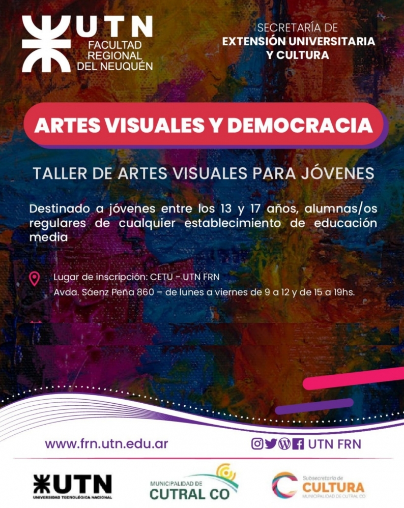 La UTN (Universidad Tecnológica Nacional – Regional Neuquén) informa a raves de la Secretaría de Extensión Universitaria y Cultura en conjunto junto con la Subsecretaría de Cultura de la Municipalidad de Cutral Co, invitan al Taller gratuito de Artes Visuales para Jóvenes.
