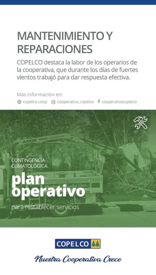 Desde la Cooperativa COPELCO se agradece y destaca la labor de los operarios que durante los días de fuertes vientos trabajó para dar respuesta efectiva a los inconvenientes generados en los servicios de energía y comunicaciones.