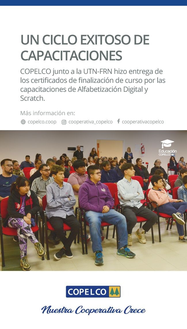 Tiempo de lectura: 57 segundosLa Cooperativa COPELCO, en conjunto con la UTN-FRN, hizo entrega de los certificados de finalización de curso por las capacitaciones de Alfabetización Digital y Scratch.