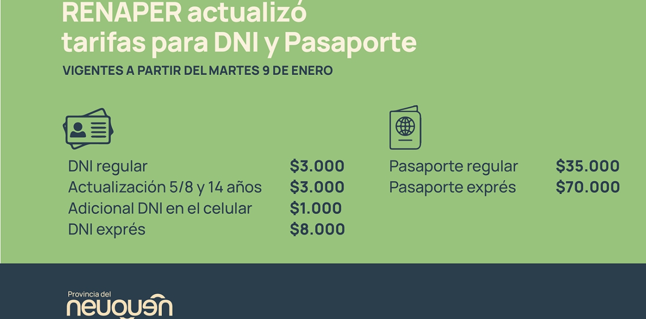 Según lo indicado oficialmente, el DNI regular tendrá un valor de $ 3000 y el exprés costará $ 8.000; ambos con vencimiento a los 15 años de ser emitidos. El Pasaporte regular pasará a costar $ 35.000 y el exprés $ 70.000.