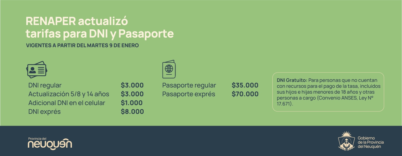 Desde la Dirección Provincial de Registro Civil del Gobierno de la Provincia informaron que el RENAPER (Registro Nacional de las Personas) pondrá en vigencia un nuevo cuadro tarifario para la gestión del documento nacional de identidad (DNI) y Pasaporte.