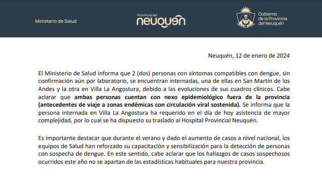 El Ministerio de Salud de la Provincia informa que dos personas con síntomas compatibles con dengue, sin confirmación aún por laboratorio, se encuentran internadas, una de ellas en San Martín de los Andes y la otra en Villa La Angostura, debido a las evoluciones de sus cuadros clínicos. Cabe aclarar que ambas personas cuentan con nexo epidemiológico fuera de la provincia (antecedentes de viaje a zonas endémicas con circulación viral sostenida). Se informa que la persona internada en Villa La Angostura ha requerido en el día de hoy asistencia de mayor complejidad, por lo cual se ha dispuesto su traslado al Hospital Provincial Neuquén.