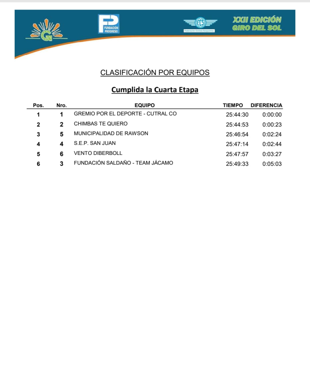 Inmediatamente, lo hizo Navarrete, que pese a no ganar esta etapa el tiempo estuvo a su favor. El podio lo completó Lucas Gaday, de Dolores Cycle Club, de Uruguay.