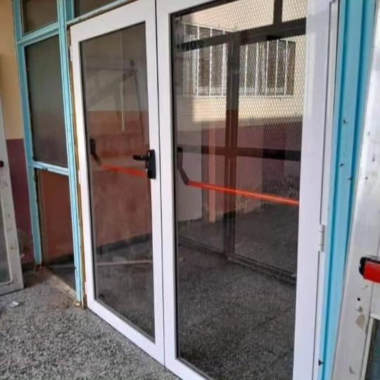 Colocación de una nueva puerta de doble hoja con vidrios blindex y cierre antipánico en el ingreso de la escuela N°151