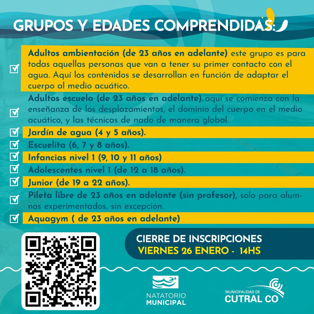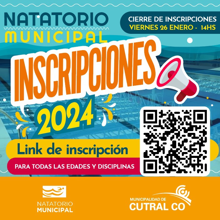 Última semana de inscripción para el Natatorio Municipal, con fecha límite el próximo viernes 26 de enero de 9 a 14Hs. Para inscribirte debes escanear el QR de la imagen y completar el formulario de inscripción o haciendo click aquí.