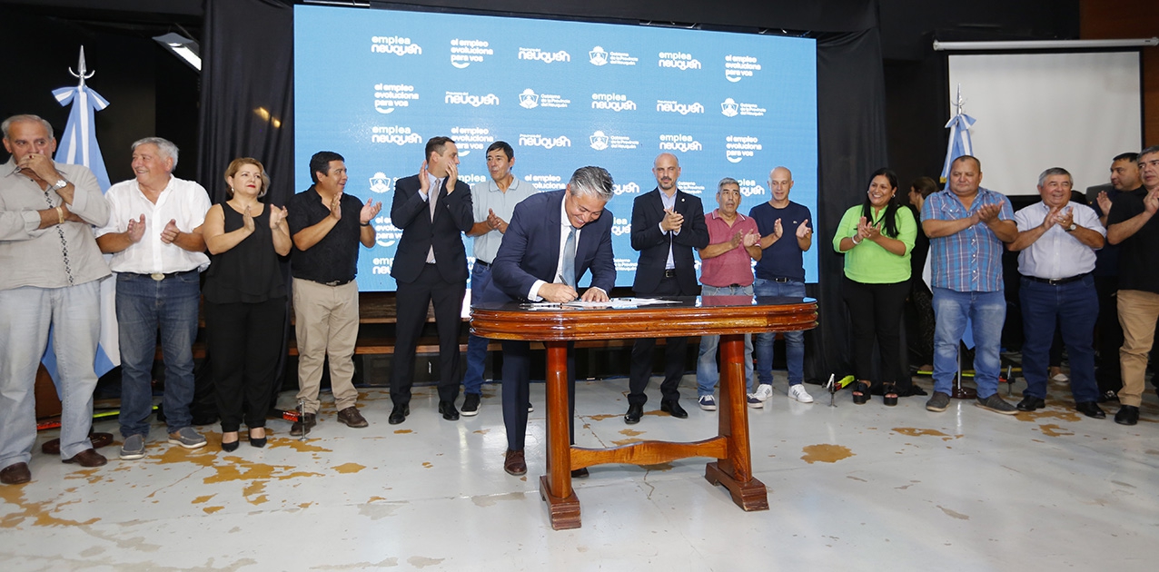 Con la firma del decreto, el gobernador Rolando Figueroa dio inicio al plan provincial Emplea Neuquén, que busca mejorar las condiciones de empleabilidad y acompañar en el trayecto formativo a personas mayores de 18 años, con residencia permanente en Neuquén y que están desempleados. Además, rubricó un acuerdo de colaboración con 30 sindicatos y gremios para la implementación y ejecución de esta política pública. Participaron, entre otros, el ministro jefe de Gabinete, Juan Luis Ousset; el ministro de Trabajo y Desarrollo Laboral, Lucas Castelli, y delegados y referentes de sindicatos y gremios de toda la provincia.