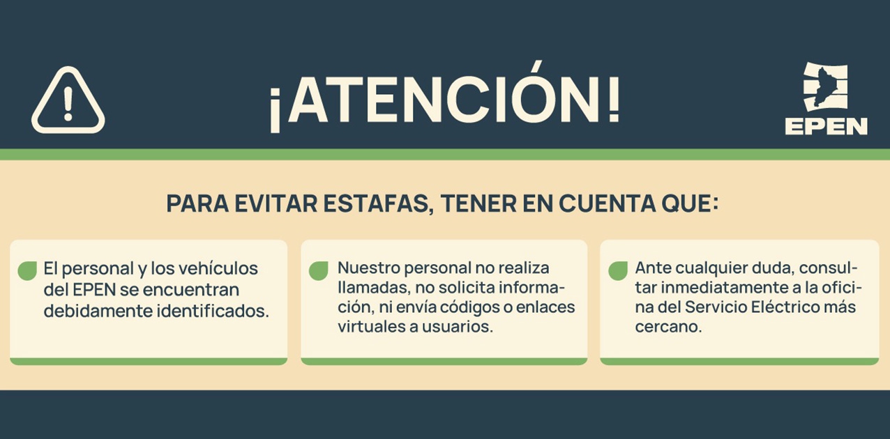 En este sentido, se comunica a la ciudadanía que el EPEN no realiza llamados de ningún tipo, no solicita información, no envía códigos ni enlaces virtuales ni datos, no acude a domicilios -salvo en caso de reclamo-, y tanto el personal como los vehículos de la empresa se encuentran debidamente identificados.