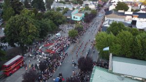 Las actividades comenzaron a las 19.30 en la céntrica plaza San Martín, donde las autoridades e integrantes de la Asociación Amigos del Museo Primeros Pobladores colocaron una ofrenda floral en el Monumento a los Pioneros. Luego se desarrolló en el palco instalado sobre avenida San Martín y Teniente Coronel Pérez, desde donde se dio comienzo al desfile de organizaciones de la comunidad. Durante el desfile, el gobernador Figueroa acompañó a los ex combatientes de Malvinas en su paso frente al palco oficial, ante un cerrado aplauso del público.