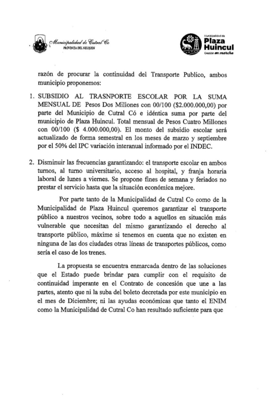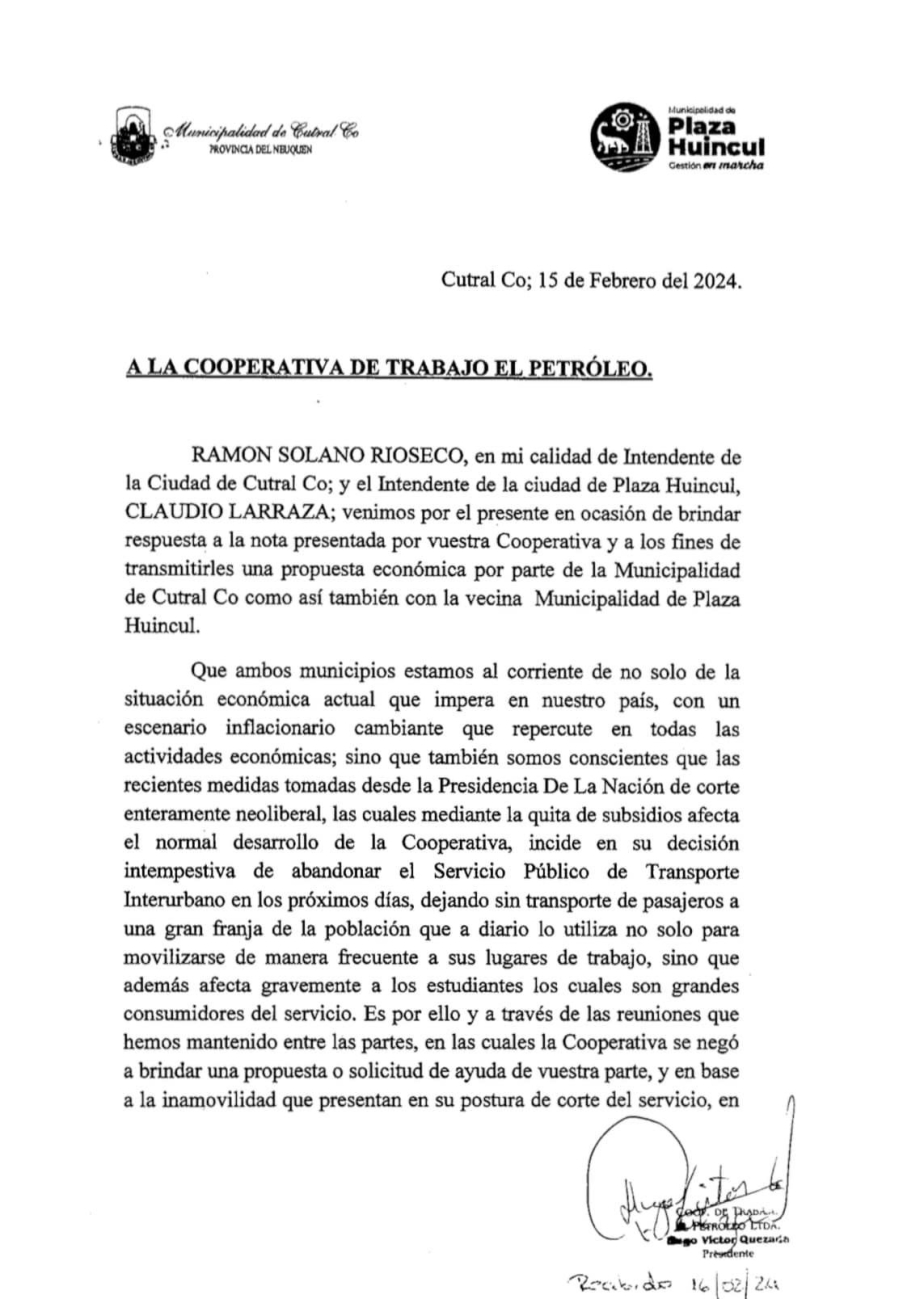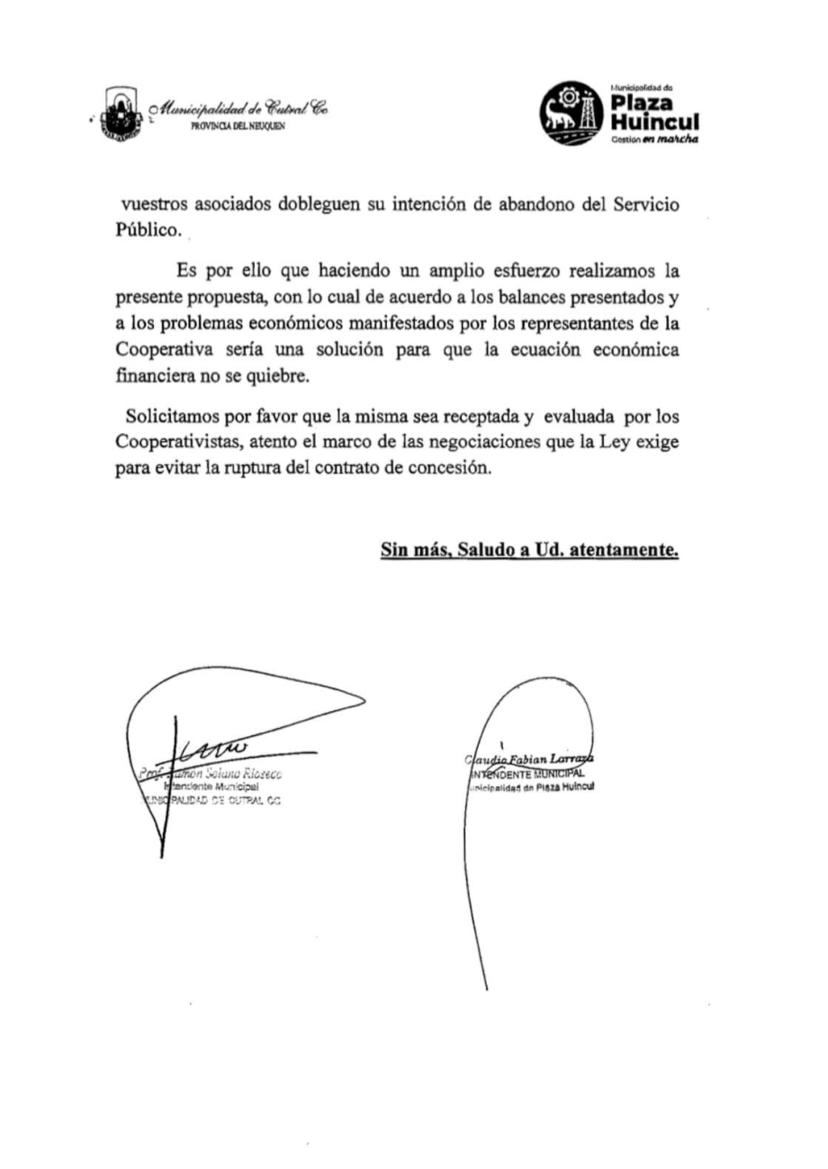 La Municipalidad de Cutral Co informa que se presentó una propuesta económica por parte de la Municipalidad de Cutral Co en conjunto con la Municipalidad de Plaza Huincul a la Cooperativa de Trabajo el Petróleo Ltda. para garantizar la continuidad del servicio los vecinos de ambas localidades.