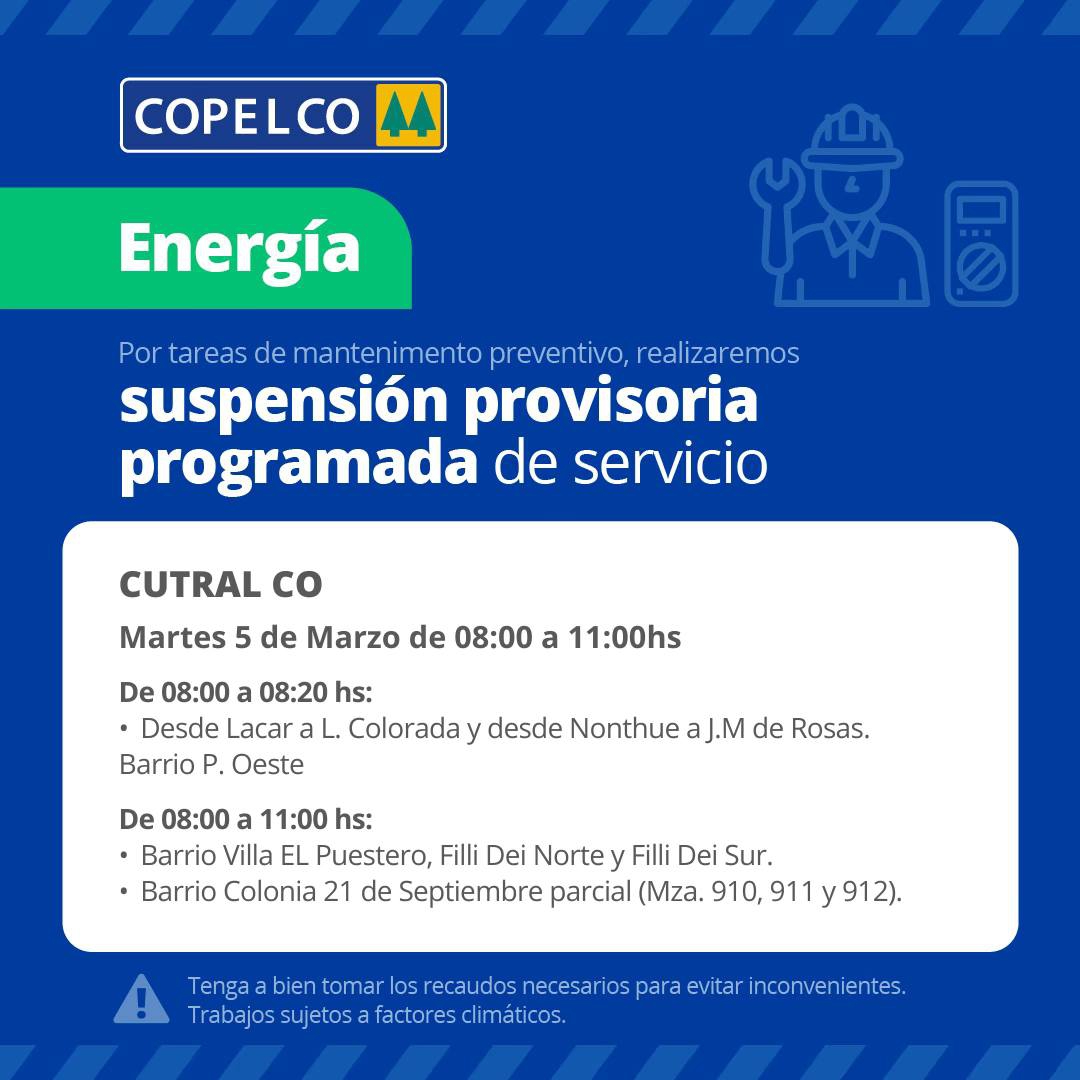 Suspensión Provisoria de Servicio de Energía para el día Martes 5 de Marzo en Cutral Co.