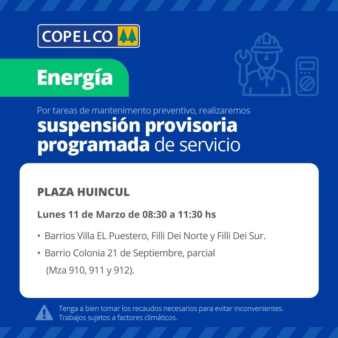 Suspensión Provisoria de Servicio de Energía para el día Lunes 11 de Marzo en Plaza Huincul.