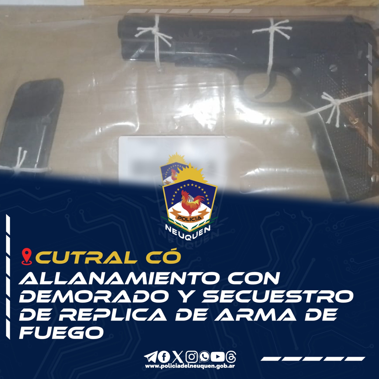Personal dependiente de la Direcci贸n Seguridad Interior Cutral C贸, llev贸 adelante el d铆a de ayer, una orden de allanamiento para un domicilio del Barrio Centenario de Plaza Hu铆ncul, donde logr贸 la demora de un hombre mayor de edad y es secuestro de una r茅plica de arma de fuego.