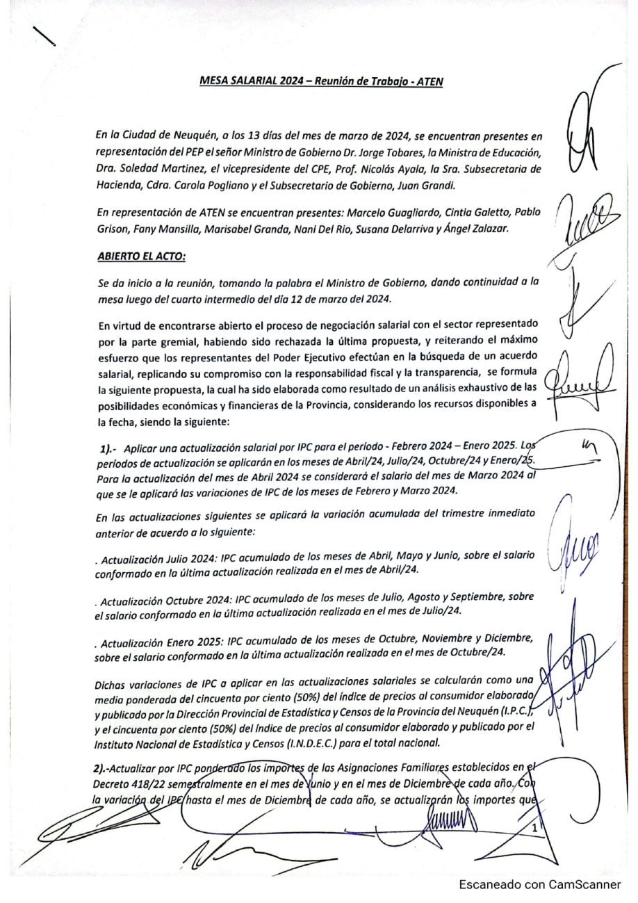 “Con muchas horas de trabajo hemos puesto a consideración de ATEN una propuesta integral que comprende no solamente la cuestión de la pauta salarial, sino abarca otras cuestiones relativas al funcionamiento del Consejo Provincial de Educación (CPE), infraestructura, partidas en materia de refrigerio, un adicional por zona que faltaba completar para algunas escuelas, y también hemos hecho un abordaje integral sobre otros aspectos que no se corregían desde mucho tiempo a la fecha”, sostuvo Tobares .