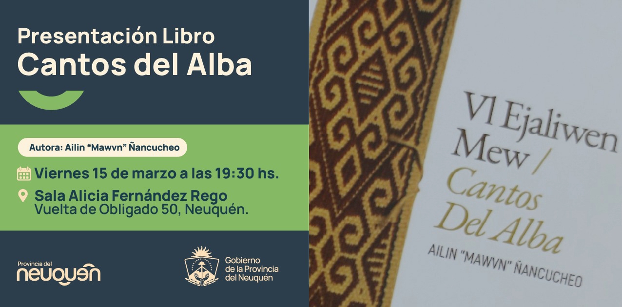 El ministerio de Desarrollo Humano, Gobiernos Locales y Mujeres, a través de la subsecretaría de Cultura, invita a la presentación del libro Cantos del Alba de la poeta Ailin Mawn Ñancucheo, editado por Editorial Hudson.