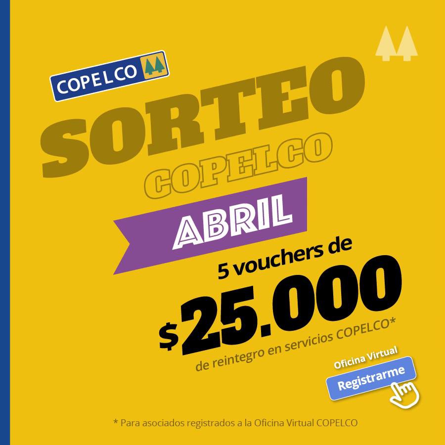 COPELCO te invita a participar en el Sorteo de abril, por 5 Vouchers de $25.000 cada uno de reintegro, para aplicarlo en la factura del servicio COPELCO que elijas.