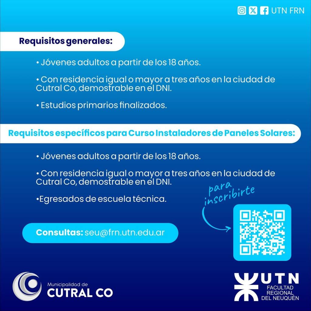 máximo de 30 personas por curso. Los mismos se dictarán en el Centro de Oficios y certificación de UTN - FRN (ubicado en el Parque de la Ciudad).