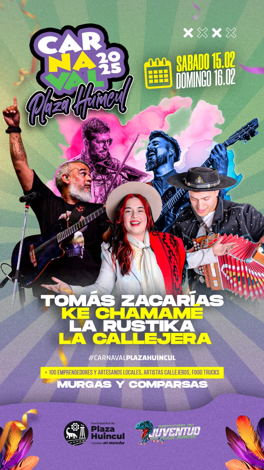El domingo 16 habrá desfiles por avenida San Martín desde las 19:30 hs. con las murgas, comparsas y batucadas del país que se dieron cita para el Carnaval de Plaza Huincul. Por la noche, al cierre del desfile, serán las presentaciones de Tomás Zacarías y Ke Chamamé.