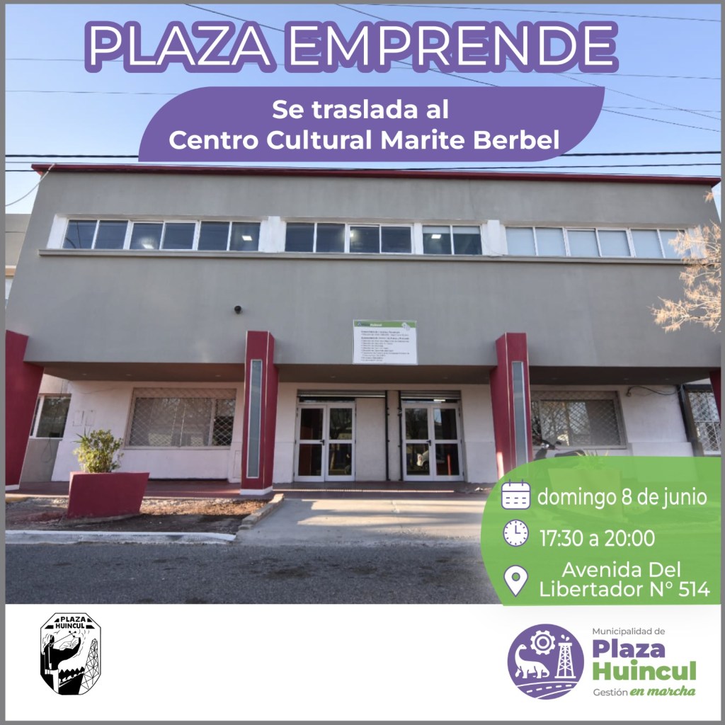 Con la llegada de las bajas temperaturas, la feria Plaza Emprende cambia de ubicación y se traslada al Centro Cultural Marité Berbel. El espacio, ubicado en avenida del Libertador 514, en el barrio Central de Plaza Huincul, brindará mayor comodidad y resguardo tanto para los emprendedores como para los visitantes.