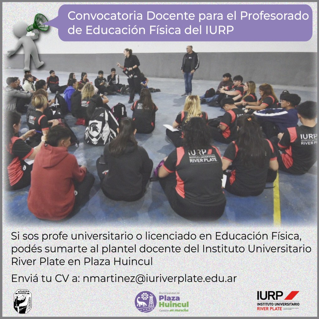 La subsecretaría de Capacitación de Plaza Huincul anuncia la convocatoria a cubrir cargos docentes para el segundo cuatrimestre del dictado del Profesorado en Educación Física del Instituto Universitario River Plate (IURP)