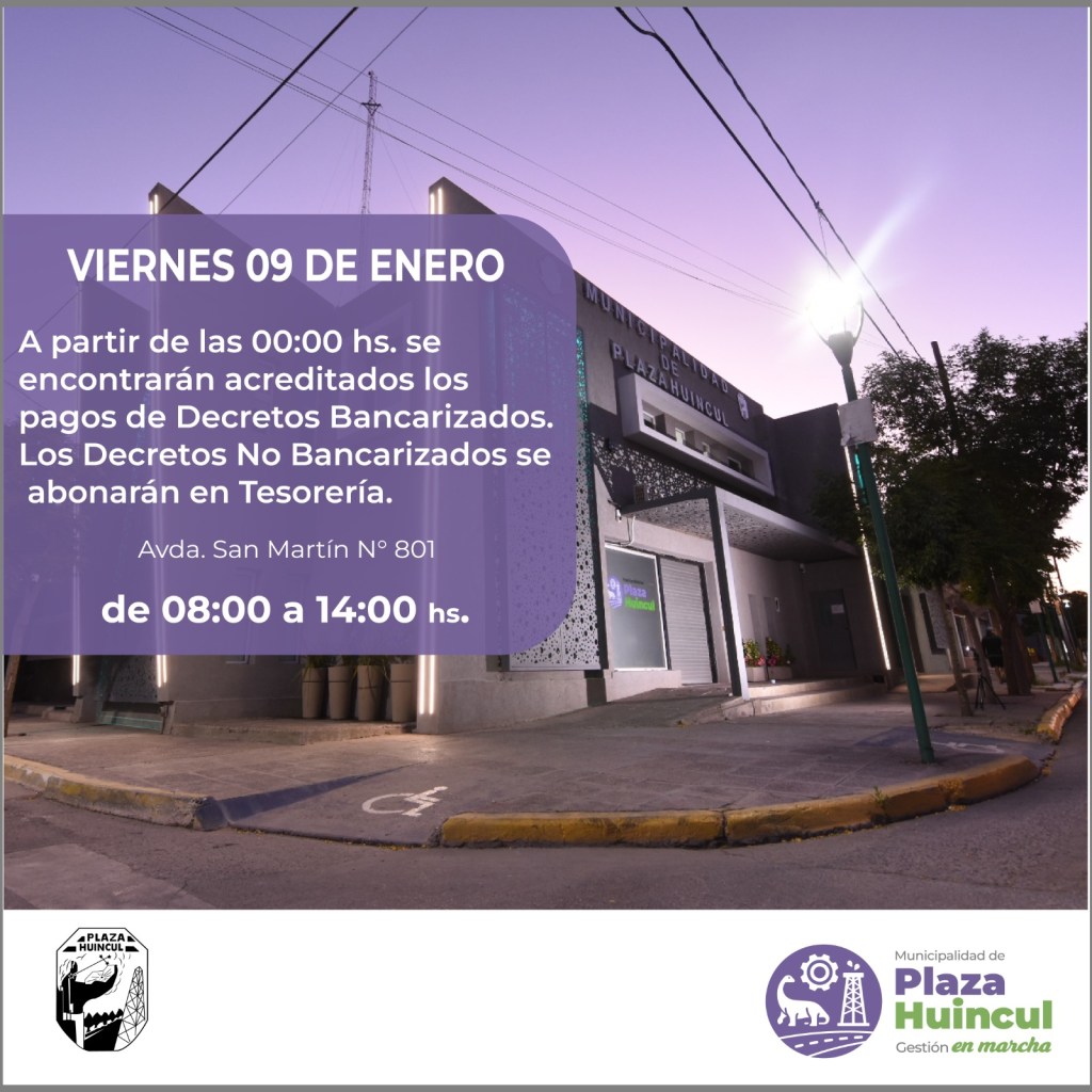 La Secretaría de Hacienda y Administración de la Municipalidad de Plaza Huincul informa que el viernes 9 de enero se realizará el pago de Decretos Municipales.